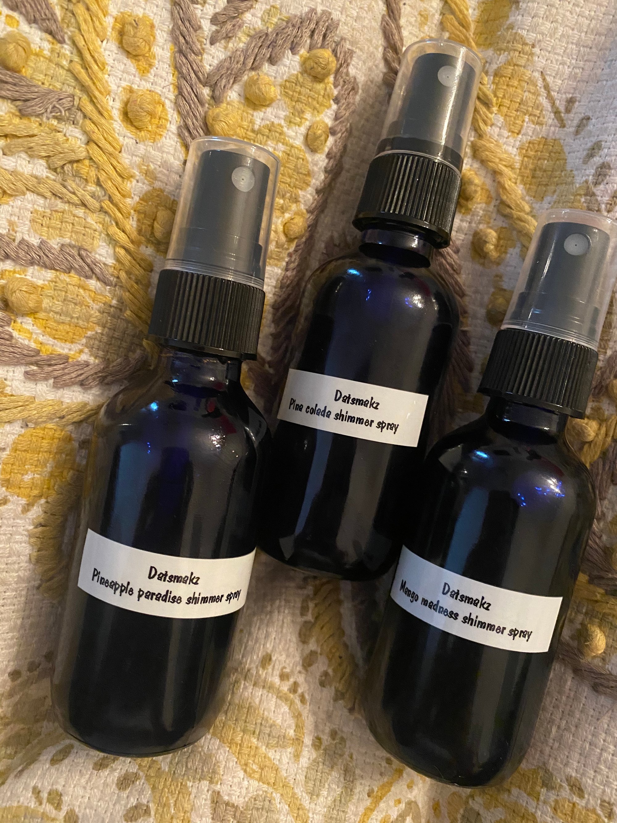 Are you looking for a natural sparkle glow? Does most body sprays make you feel sticky? Well here at datsmakz we really make it our priority to make all our products not have that effect. This all natural body spray is mostly made out of coconut oil and mineral oil and vitamin e oil. Added some bronze shimmer powder and sparkles! These beauties come in three essential oil fragrances Pineapple paradise, Mango madness, Pina Colada.