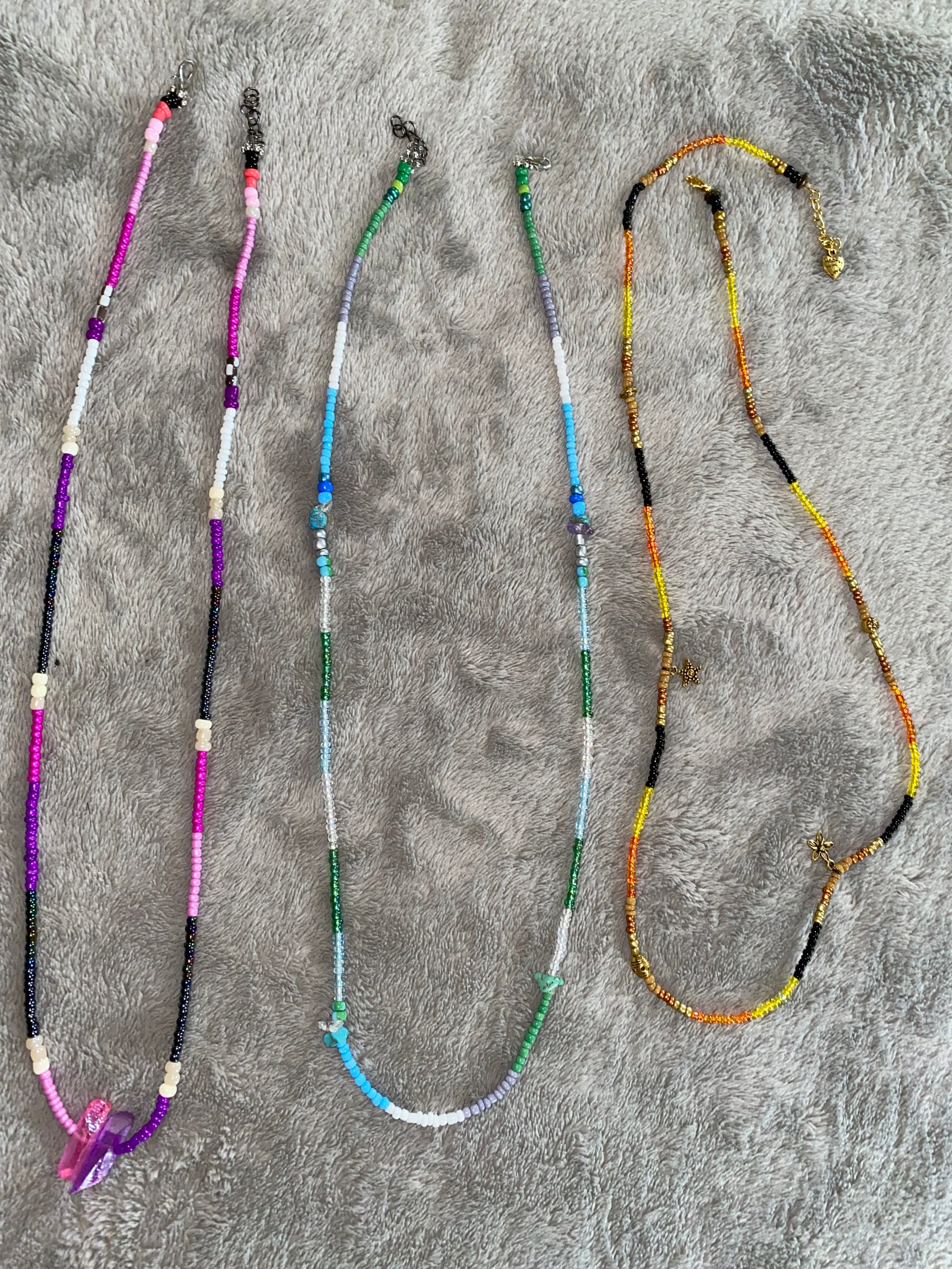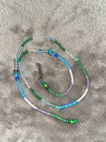 Earth vibes is 29 inches long with links for extra room. Earth vibes Is blue and green with healing stones .