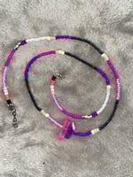 Pinky is about 28 inches long with links for extra room. Pinky is pink and purple with crystals in the center.