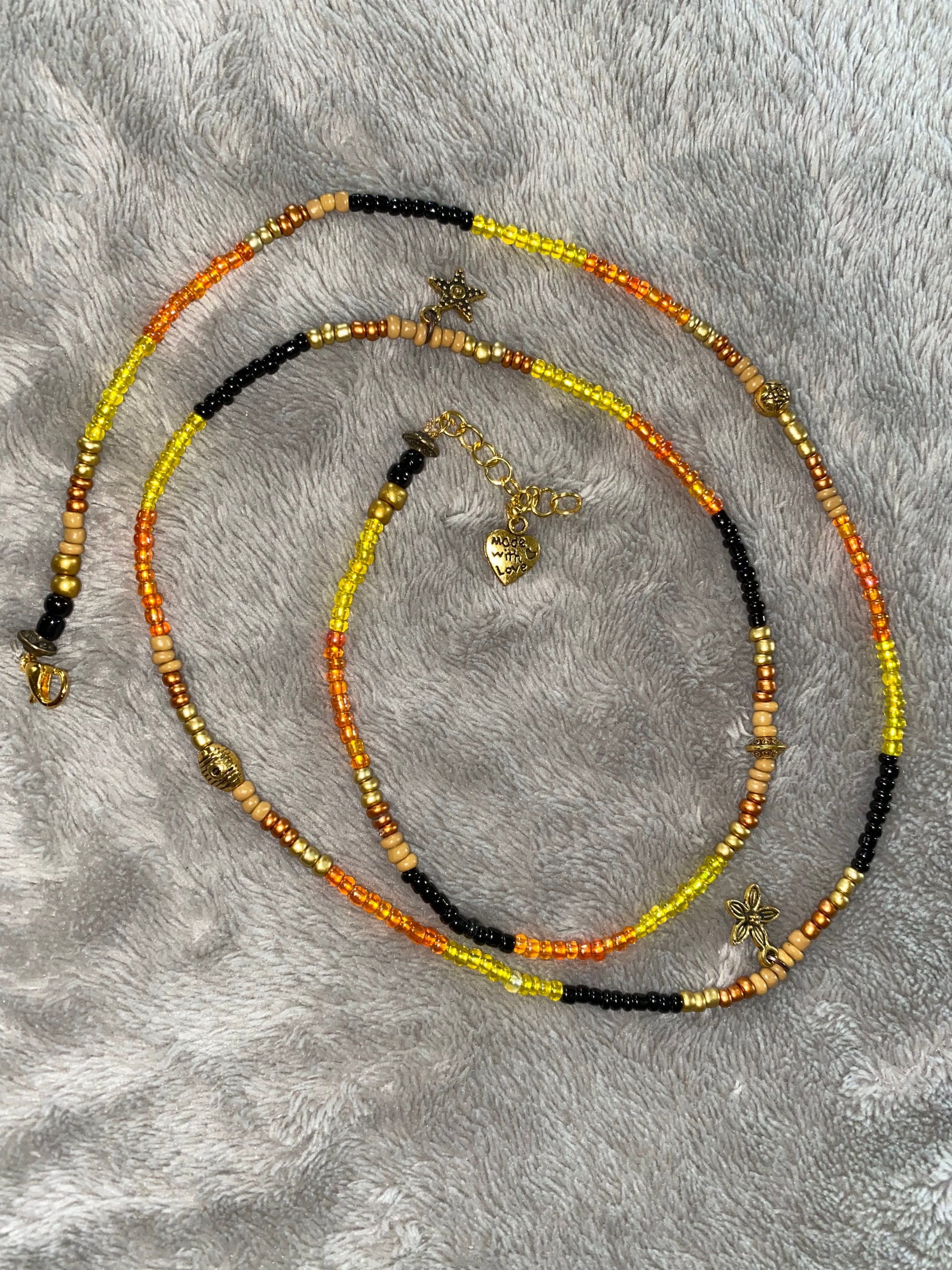Golden is 30 inches long with links for extra room . Golden is Orange , yellow , gold and black. Golden is made with charms .